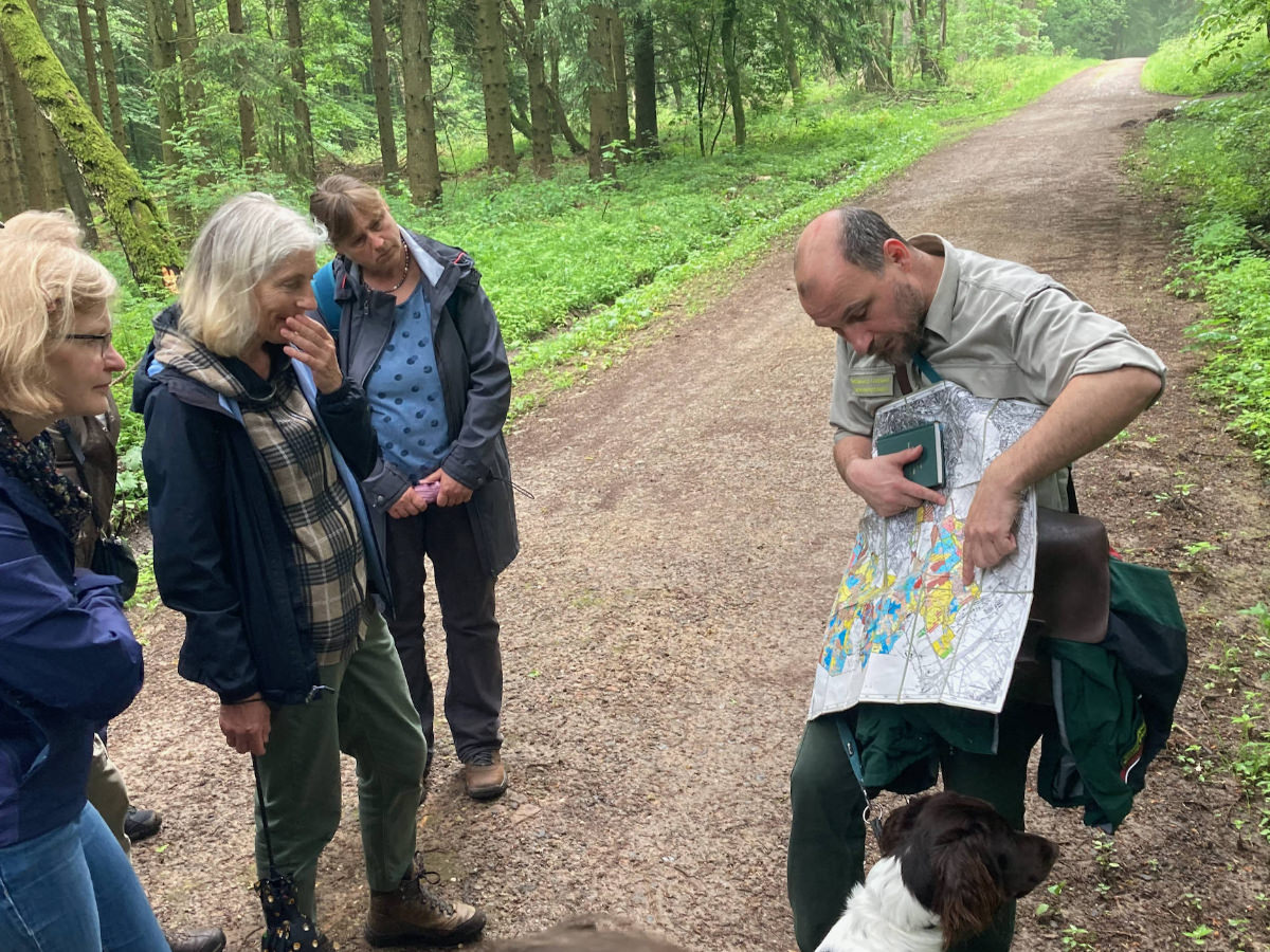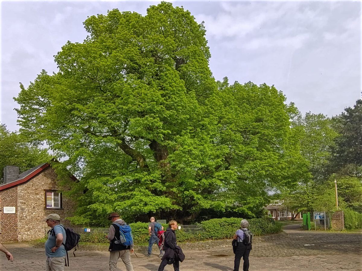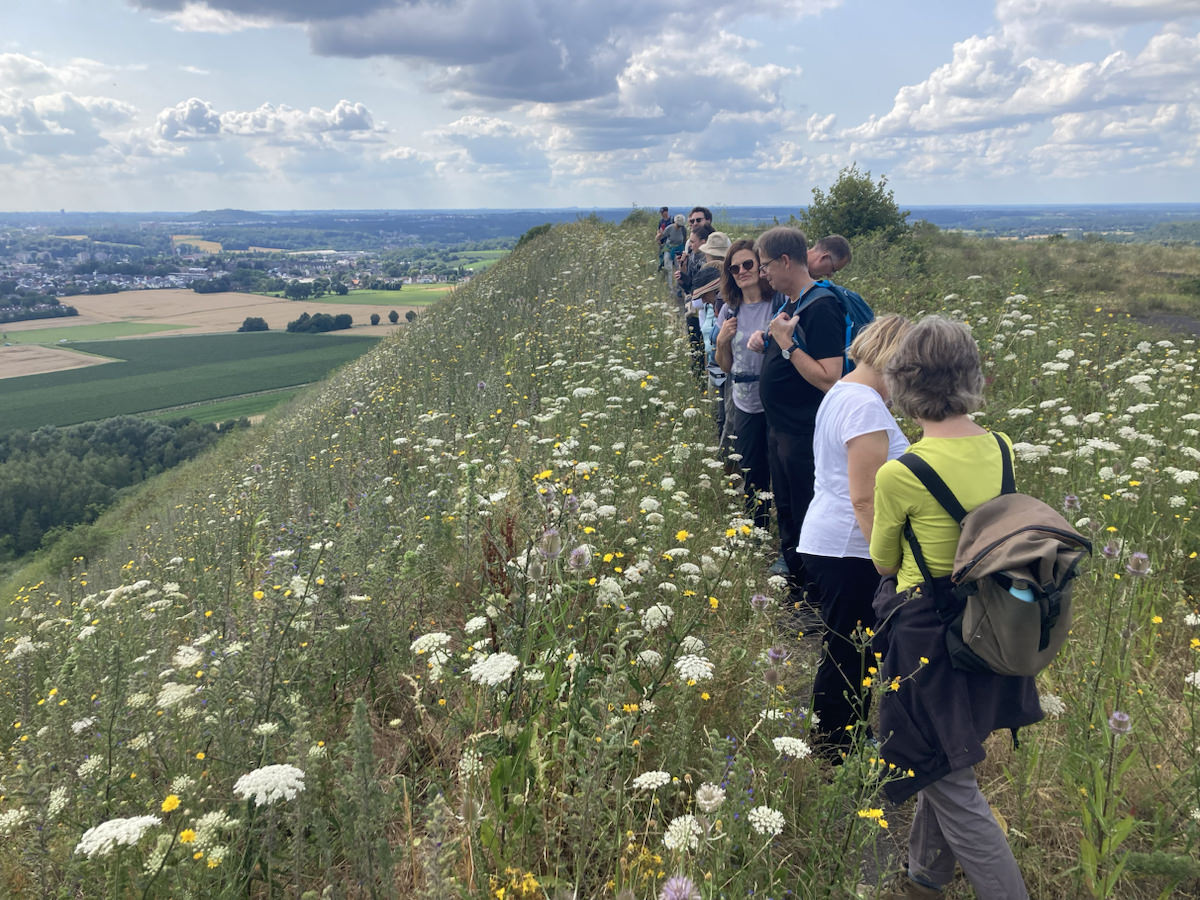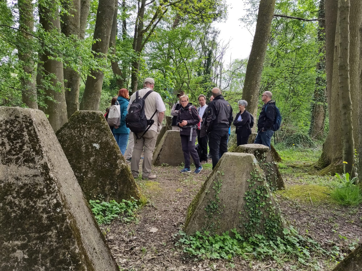 Beeindruckenden Zeitmaßstäben begegnet die Tour auch am fünften Tag. Los gehts an der tausend Jahre alten Forster Linde, die als lebendes Wesen schon viele Strukturwandel überdauert hat und in deren Schatten wir über die Erfucht vor dem Leben und den Klimawandel in Austausch treten. Einen denkbar befremdlichen Kontrast hierzu bilden die groben Betonhöcker des „Westwalls“. Unweit dieser Relikte jenes doch so rasch untergegangen „tausendjährigen Reichs“ verweist der „Landgraben“ mit den überkommenen, lebendigen Grenzbuchen auf das „Aachener Reich“ (14. Jhd.). In der aufgegebenen belgischen Zollstation, die nun als Kulturraum genutzt wird, schließt diese Bildungsveranstaltung.