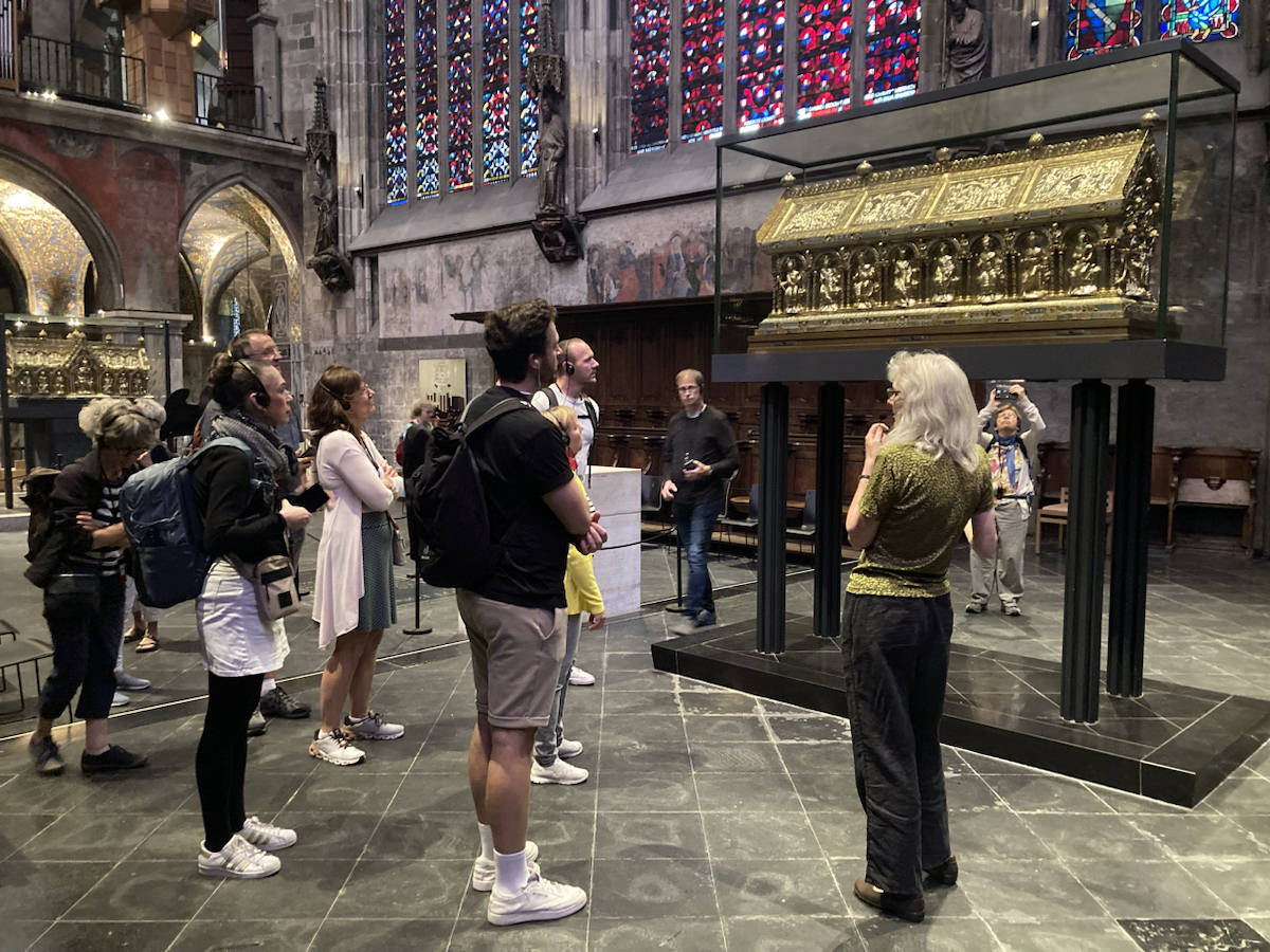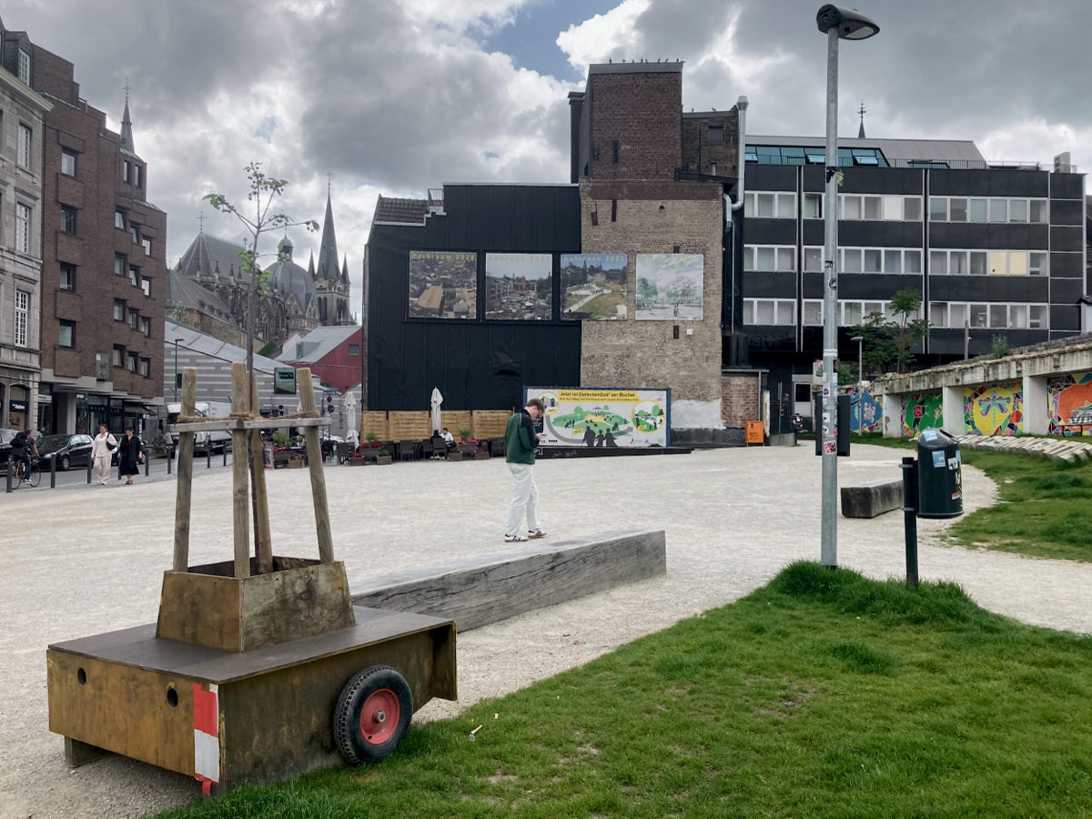 Den Auftakt bildet ein Rundgang durch Aachens Zentrum mit besonderem Augenmerk auf die Zeugnisse aus vorindustrieller Zeit: Die Thermalquellen waren für die Entwicklung der Stadt von jeher von besonderer Bedeutung. Archäologische Fenster in den Untergrund lassen Reste der kanalisierten Bäche sichtbar werden, die einst zahlreiche Mühlen der Nadel- und Tuchmanufakturen antrieben. Im Zentrum findet sich ebenfalls die Technische Hochschule RWTH und Aachens erstes Elektrizitätswerk – beides Zeichen der sich mit Macht durchsetzenden Industrialisierung. Auf letztere stößt die Tour auch in der nördlich an die Stadt angrenzenden Landschaft Soers: Im Industriedenkmal Tuchwerk vermitteln noch funktionierende Maschinen der Garn- und Tuchherstellung eindrücklich die Bedingungen in der Industriearbeit, wie diese bis in die 1980er Jahren in Deutschland bestanden – und heutzutage in Übersee weiterhin bestehen. Der Besuch eines Fair-Trade-Modeladens schlägt in diesem Sinne ebenfalls eine Brücke von den einst bedeutenden Aachener Tuchfabriken in die gegenwärtigen Produktionen im globalen Süden für unseren Bedarf. Auf das Konzept Weltacker und das Mietgarten-Angebot mein garten stößt die Tour ebenfalls in der Soers. Mit diesem Landschaftsbereich, wie auch mit dem Aachener Lousberg und dem Müschpark, durchwandert die Tour einen Abschnitt des regionalen „Pferdelandparks“, welcher zurückliegender Landnutzungen mit heutigen Elementen zu einer Erzählung verbindet und so das Ganze als besondere, gegenwärtige Landschaft lesbar werden lässt.