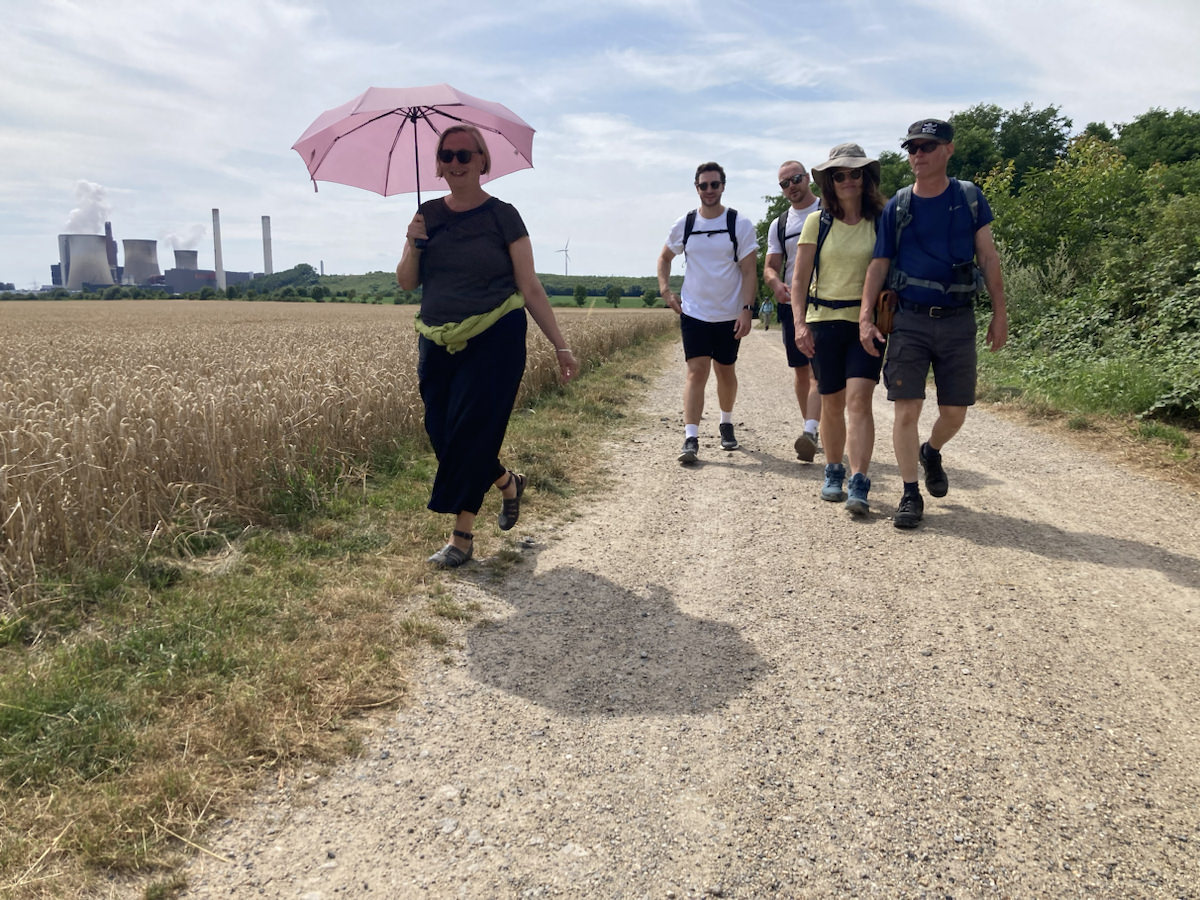 Hingegen deutlich in die Tiefe gehen die „Phänomene“ des Braunkohlenbergbaus. So ist der besuchte Blausteinsee leicht als geflutetes Restloch des einstigen Tagebaus „Zukunft“ zu dechiffrieren, was dessen Attraktivität bei Erholungssuchenden jedoch nicht mindert. Hingegen minderten die vergangenen Dürresommer deutlich erkennbar den Wasserstand dieses Sees. Die Wanderung entlang dem mit Schilfgürtel bewachsenen Uferstreifen und weiter bis zum Aussichtspunkt des aktiven Tagebaus Inden lässt erwartbar einige Fragen auftauchen, etwa die, über wie viele Jahrzehnte (oder Generationen) sich die geplanten Flutungen der noch bis 2030 betriebenen Tagebaue wohl hinziehen werden. Die Vision Indeland2050 formuliert hierzu Zukunftsszenarien, die das absehbar verbleibende „Loch“ vergleichbar dem Beispiel des Blausteinsees in eine positiv bewertete Seenlandschaft wandeln sollen. Im vergangenen Jahrhundert hätten diese Pläne sehr wahrscheinlich funktioniert – im Zeitalter des Klimawandels steht darüber ein übergroßes Fragezeichen.